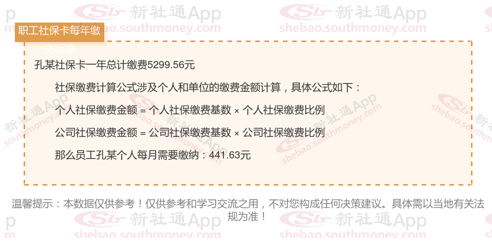 由上图得知,孔某社保卡一年需要缴纳5299.56元,职工个人月缴纳441.63元,若您想要了解明细点击新社通社保计算器,来了解一下明细吧。