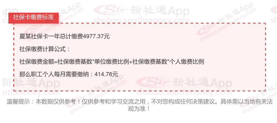 由上图得知,夏某社保卡一年需要缴纳4977.37元,职工个人月缴纳414.78元,若您想要了解明细点击新社通社保计算器,来了解一下明细吧。
