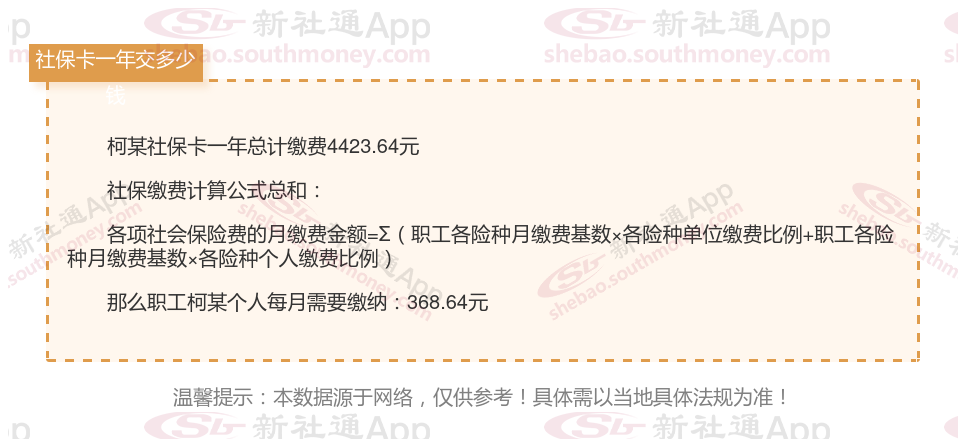 由上图得知,柯某社保卡一年需要缴纳4423.64元,个人部分每月需要缴纳368.64元,若您想要了解明细点击新社通社保计算器,来了解一下明细吧。