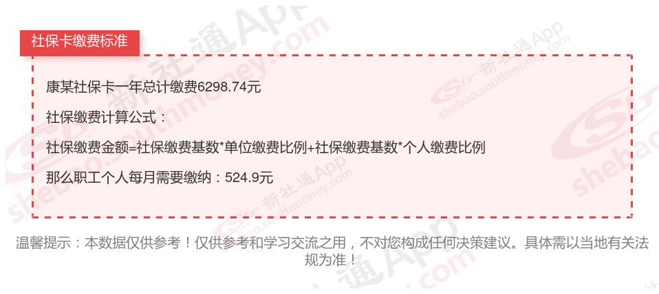 由上图得知,康某社保卡一年需要缴纳6298.74元,职工个人月缴纳524.9元,若您想要了解明细点击新社通社保计算器,来了解一下明细吧。