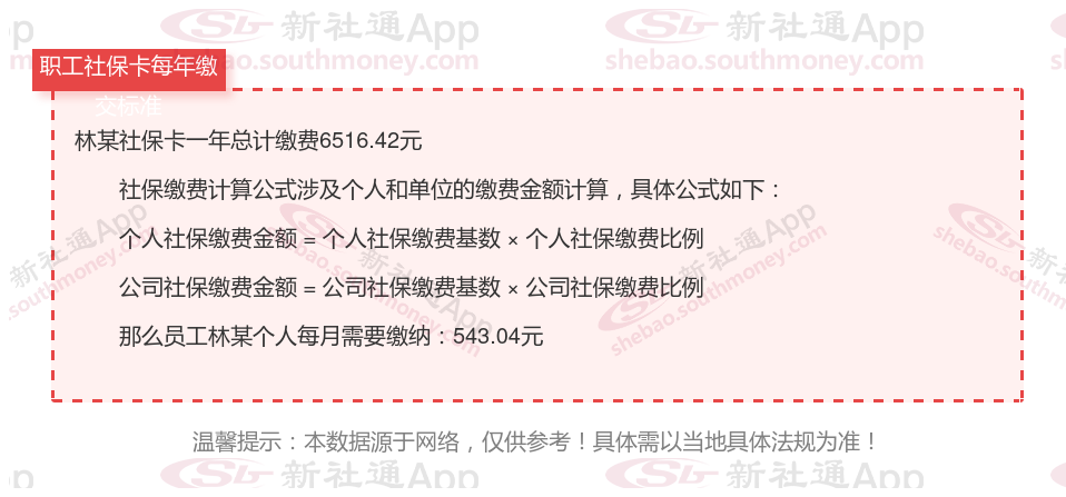由上图得知,林某社保卡一年需要缴纳6516.42元,个人部分每月需要缴纳543.04元,若您想要了解明细点击新社通社保计算器,来了解一下明细吧。