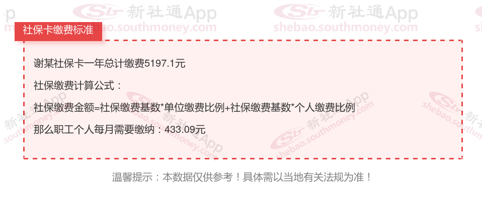 由上图得知,谢某社保卡一年需要缴纳5197.1元,个人部分每月需要缴纳433.09元,若您想要了解明细点击新社通社保计算器,来了解一下明细吧。
