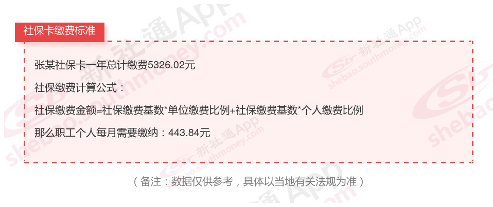 由上图得知,张某社保卡一年需要缴纳5326.02元,个人部分每月需要缴纳443.84元,若您想要了解明细点击新社通社保计算器,来了解一下明细吧。
