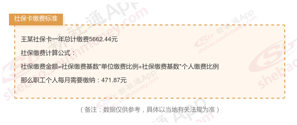 由上图得知,王某社保卡一年需要缴纳5662.44元,个人部分每月需要缴纳471.87元,若您想要了解明细点击新社通社保计算器,来了解一下明细吧。