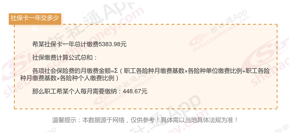 由上图得知,希某社保卡一年需要缴纳5383.98元,职工个人月缴纳448.67元,若您想要了解明细点击新社通社保计算器,来了解一下明细吧。