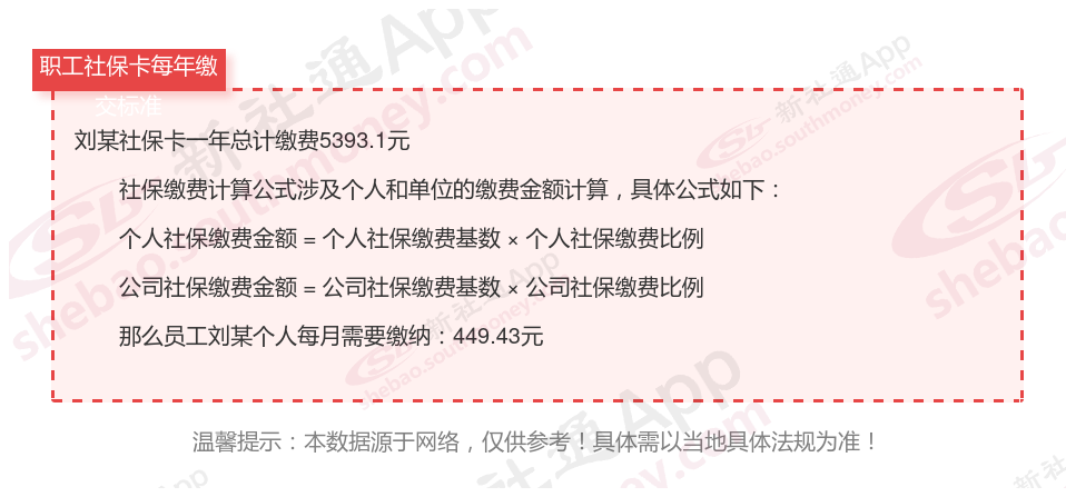由上图得知,刘某社保卡一年需要缴纳5393.1元,职工个人月缴纳449.43元,若您想要了解明细点击新社通社保计算器,来了解一下明细吧。