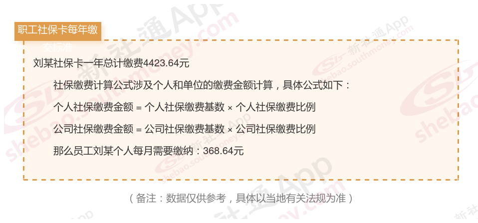 由上图得知,刘某社保卡一年需要缴纳4423.64元,职工个人月缴纳368.64元,若您想要了解明细点击新社通社保计算器,来了解一下明细吧。