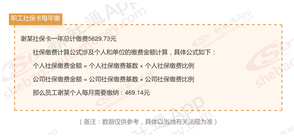 由上图得知,谢某社保卡一年需要缴纳5629.73元,个人部分每月需要缴纳469.14元,若您想要了解明细点击新社通社保计算器,来了解一下明细吧。