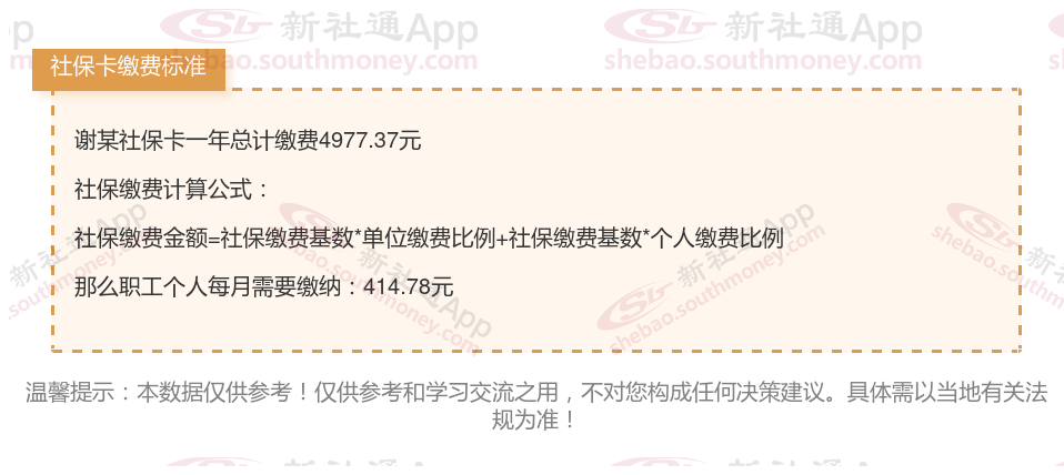 由上图得知,谢某社保卡一年需要缴纳4977.37元,职工个人月缴纳414.78元,若您想要了解明细点击新社通社保计算器,来了解一下明细吧。