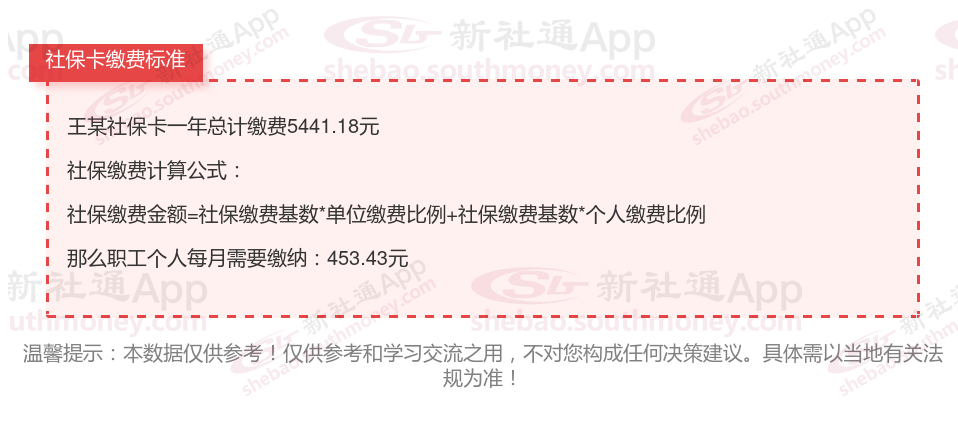 由上图得知,王某社保卡一年需要缴纳5441.18元,职工个人月缴纳453.43元,若您想要了解明细点击新社通社保计算器,来了解一下明细吧。