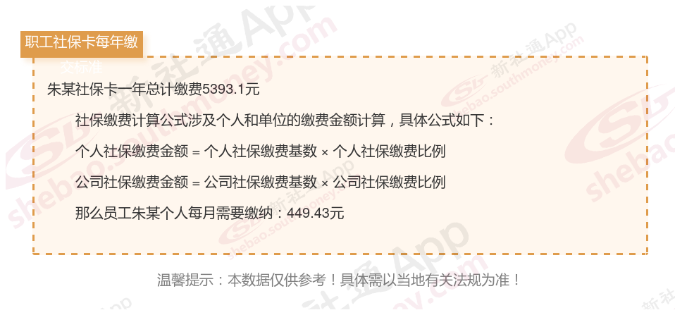 (2)社保卡每年交多少?以朱某职工社保为例: