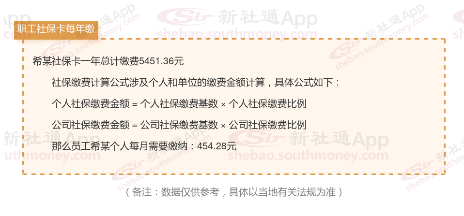 由上图得知,希某社保卡一年需要缴纳5451.36元,职工个人月缴纳454.28元,若您想要了解明细点击新社通社保计算器,来了解一下明细吧。