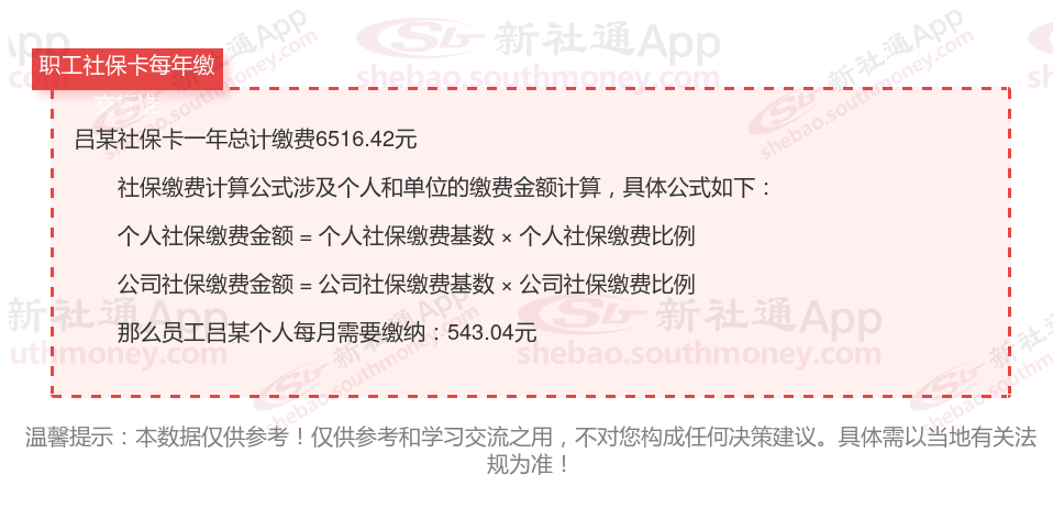 由上图得知,吕某社保卡一年需要缴纳6516.42元,个人部分每月需要缴纳543.04元,若您想要了解明细点击新社通社保计算器,来了解一下明细吧。