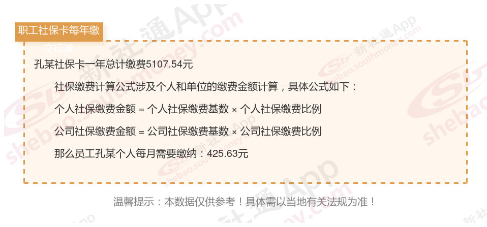 由上图得知,孔某社保卡一年需要缴纳5107.54元,个人部分每月需要缴纳425.63元,若您想要了解明细点击新社通社保计算器,来了解一下明细吧。