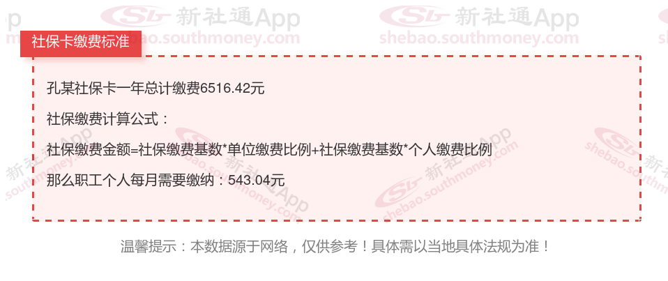 由上图得知,孔某社保卡一年需要缴纳6516.42元,职工个人月缴纳543.04元,若您想要了解明细点击新社通社保计算器,来了解一下明细吧。