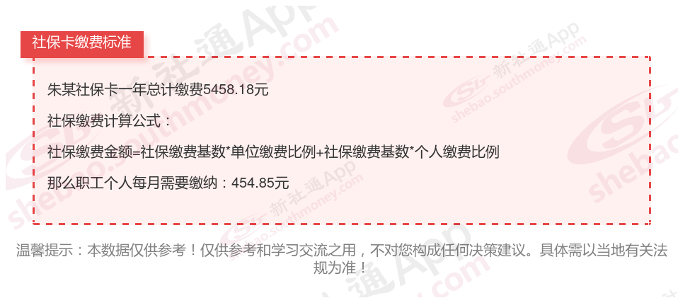 由上图得知,朱某社保卡一年需要缴纳5458.18元,个人部分每月需要缴纳454.85元,若您想要了解明细点击新社通社保计算器,来了解一下明细吧。