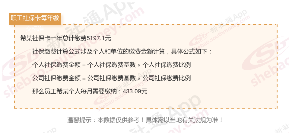 由上图得知,希某社保卡一年需要缴纳5197.1元,个人部分每月需要缴纳433.09元,若您想要了解明细点击新社通社保计算器,来了解一下明细吧。