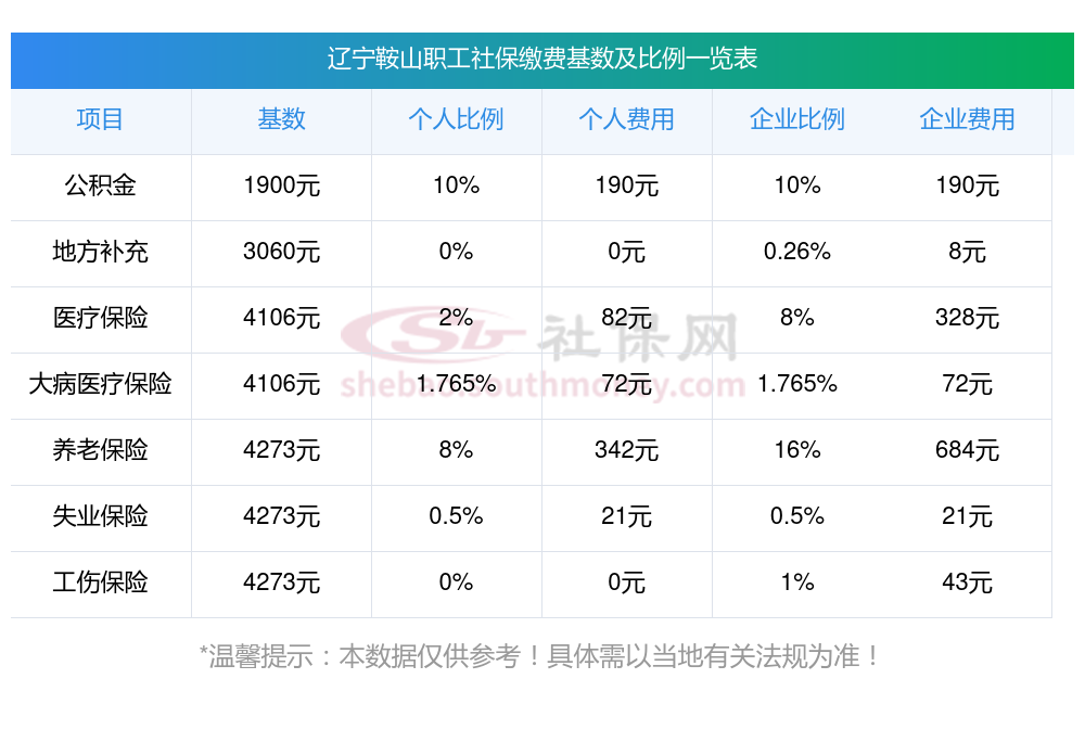社保卡交社保每年多少钱?下表是2025年辽宁鞍山社保费用明细参考,新社通app-社保缴费查询工具提供的最新数据如下: