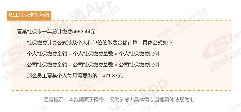 由上图得知,夏某社保卡一年需要缴纳5662.44元,个人部分每月需要缴纳471.87元,若您想要了解明细点击新社通社保计算器,来了解一下明细吧。