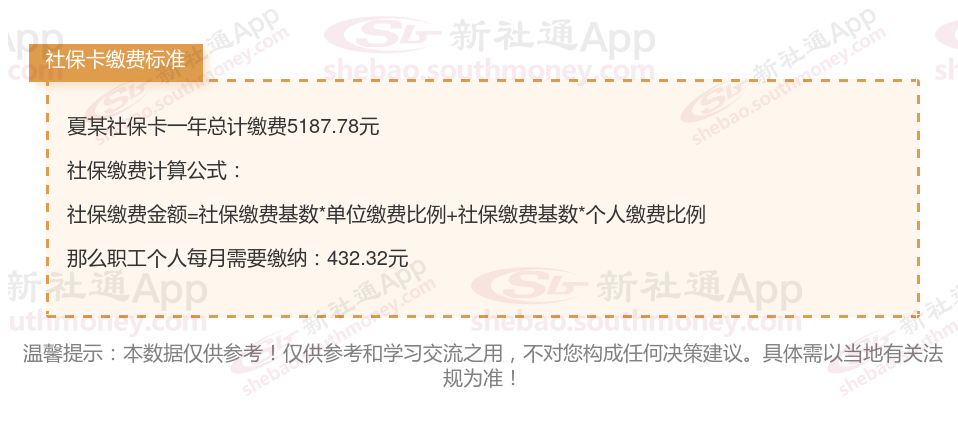 由上图得知,夏某社保卡一年需要缴纳5187.78元,职工个人月缴纳432.32元,若您想要了解明细点击新社通社保计算器,来了解一下明细吧。