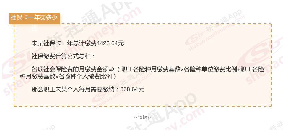 由上图得知,朱某社保卡一年需要缴纳4423.64元,个人部分每月需要缴纳368.64元,若您想要了解明细点击新社通社保计算器,来了解一下明细吧。