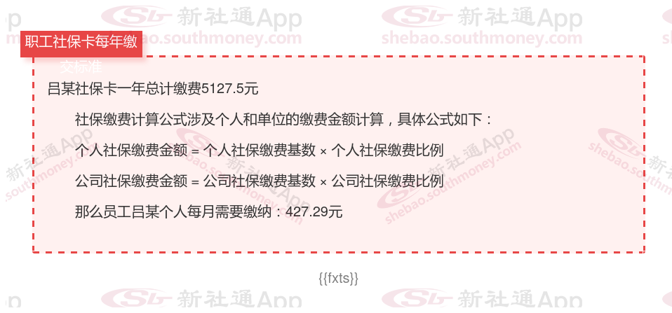 由上图得知,吕某社保卡一年需要缴纳5127.5元,职工个人月缴纳427.29元,若您想要了解明细点击新社通社保计算器,来了解一下明细吧。