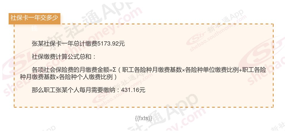 由上图得知,张某社保卡一年需要缴纳5173.92元,个人部分每月需要缴纳431.16元,若您想要了解明细点击新社通社保计算器,来了解一下明细吧。
