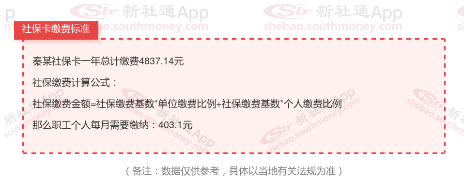 由上图得知,秦某社保卡一年需要缴纳4837.14元,个人部分每月需要缴纳403.1元,若您想要了解明细点击新社通社保计算器,来了解一下明细吧。