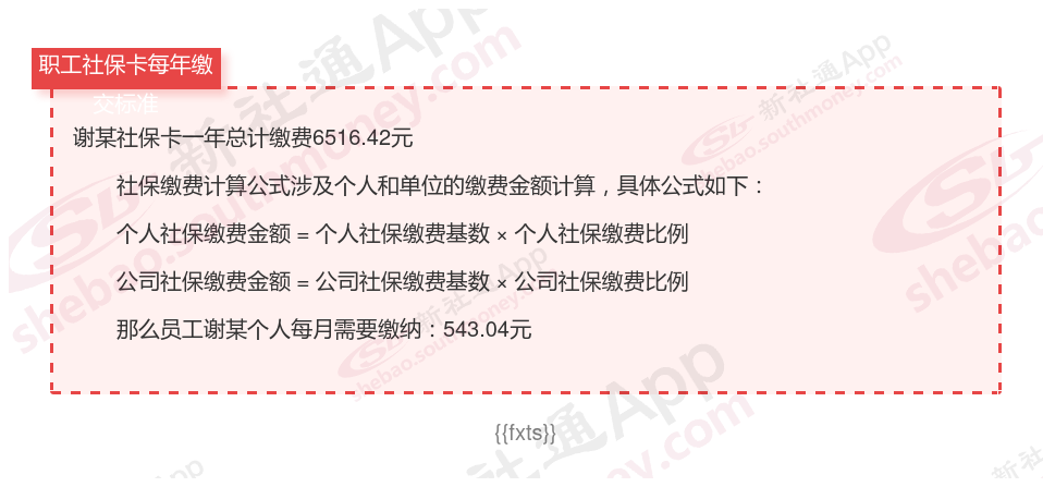 由上图得知,谢某社保卡一年需要缴纳6516.42元,个人部分每月需要缴纳543.04元,若您想要了解明细点击新社通社保计算器,来了解一下明细吧。