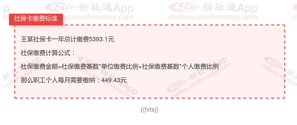 由上图得知,王某社保卡一年需要缴纳5393.1元,个人部分每月需要缴纳449.43元,若您想要了解明细点击新社通社保计算器,来了解一下明细吧。