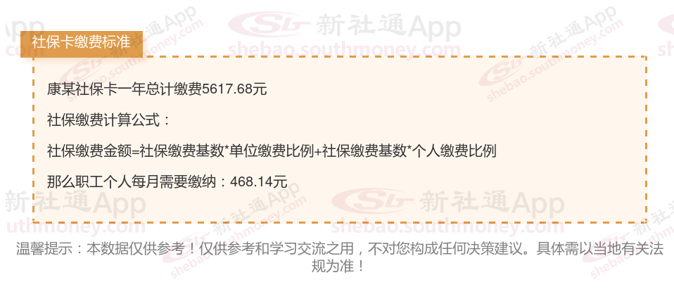 由上图得知,康某社保卡一年需要缴纳5617.68元,职工个人月缴纳468.14元,若您想要了解明细点击新社通社保计算器,来了解一下明细吧。
