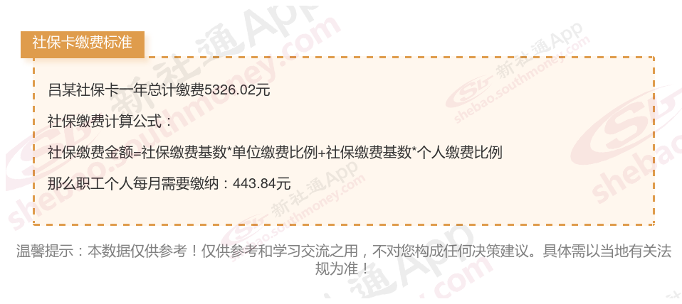 由上图得知,吕某社保卡一年需要缴纳5326.02元,职工个人月缴纳443.84元,若您想要了解明细点击新社通社保计算器,来了解一下明细吧。