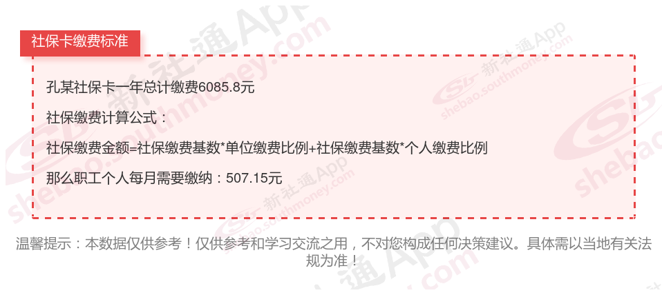 由上图得知,孔某社保卡一年需要缴纳6085.8元,职工个人月缴纳507.15元,若您想要了解明细点击新社通社保计算器,来了解一下明细吧。