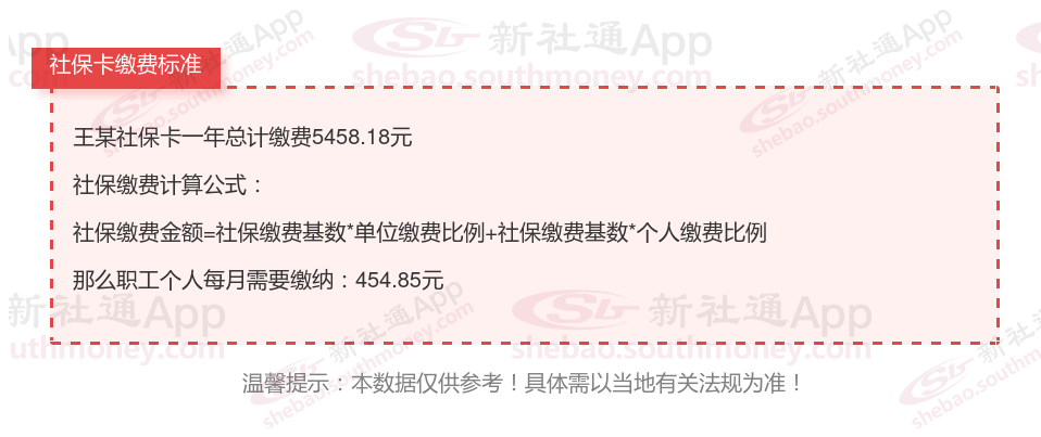 由上图得知,王某社保卡一年需要缴纳5458.18元,职工个人月缴纳454.85元,若您想要了解明细点击新社通社保计算器,来了解一下明细吧。