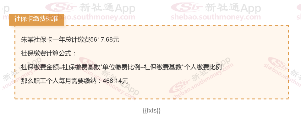 由上图得知,朱某社保卡一年需要缴纳5617.68元,职工个人月缴纳468.14元,若您想要了解明细点击新社通社保计算器,来了解一下明细吧。