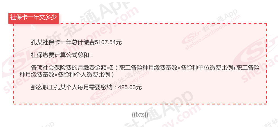 由上图得知,孔某社保卡一年需要缴纳5107.54元,职工个人月缴纳425.63元,若您想要了解明细点击新社通社保计算器,来了解一下明细吧。