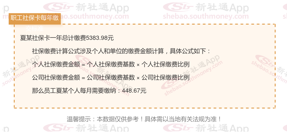 由上图得知,夏某社保卡一年需要缴纳5383.98元,个人部分每月需要缴纳448.67元,若您想要了解明细点击新社通社保计算器,来了解一下明细吧。