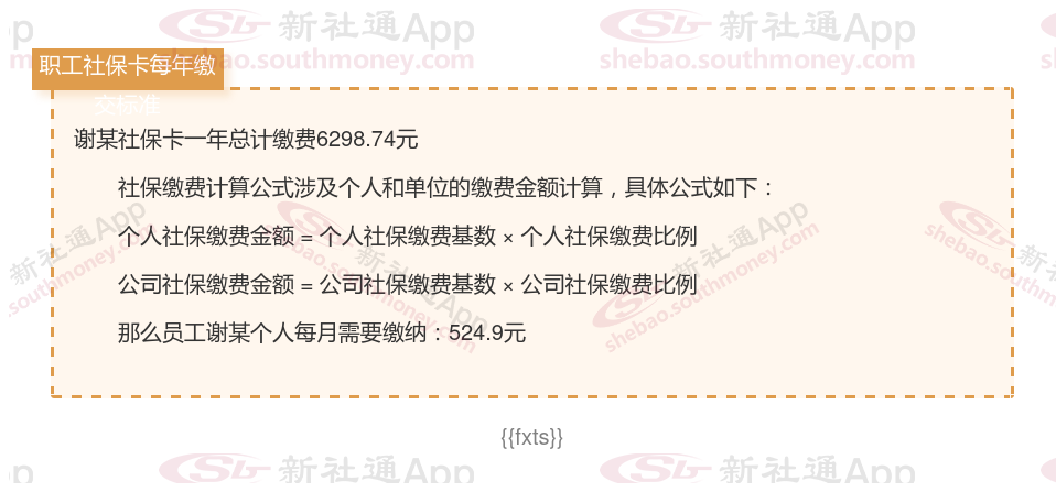 由上图得知,谢某社保卡一年需要缴纳6298.74元,职工个人月缴纳524.9元,若您想要了解明细点击新社通社保计算器,来了解一下明细吧。