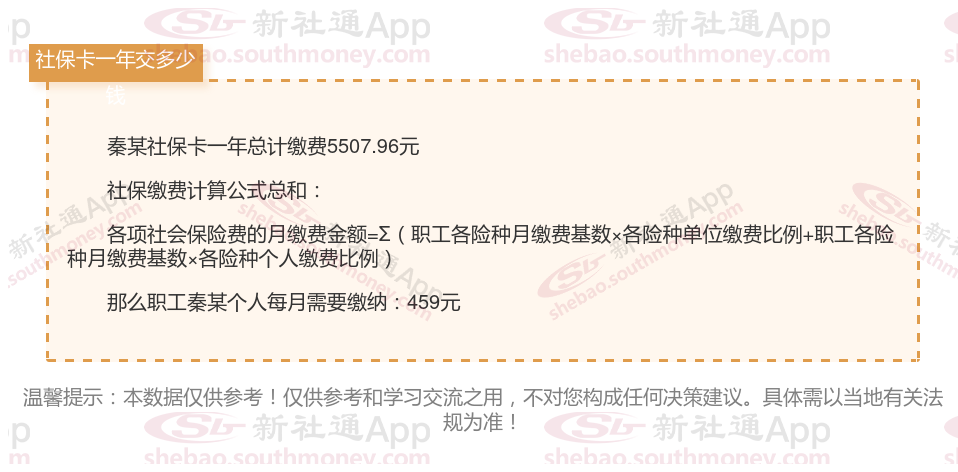 由上图得知,秦某社保卡一年需要缴纳5507.96元,职工个人月缴纳459元,若您想要了解明细点击新社通社保计算器,来了解一下明细吧。