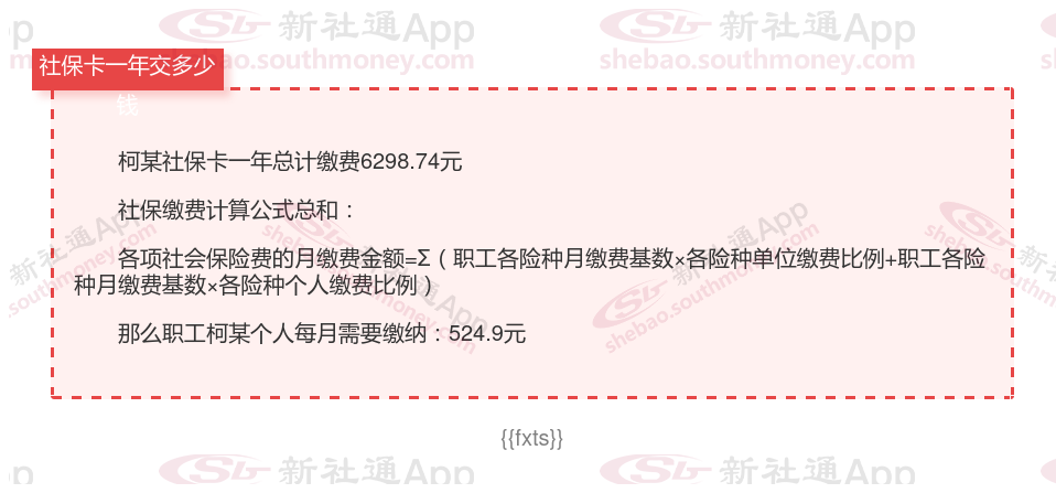 由上图得知,柯某社保卡一年需要缴纳6298.74元,个人部分每月需要缴纳524.9元,若您想要了解明细点击新社通社保计算器,来了解一下明细吧。