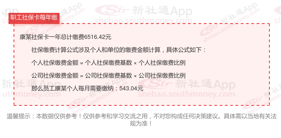 由上图得知,康某社保卡一年需要缴纳6516.42元,职工个人月缴纳543.04元,若您想要了解明细点击新社通社保计算器,来了解一下明细吧。