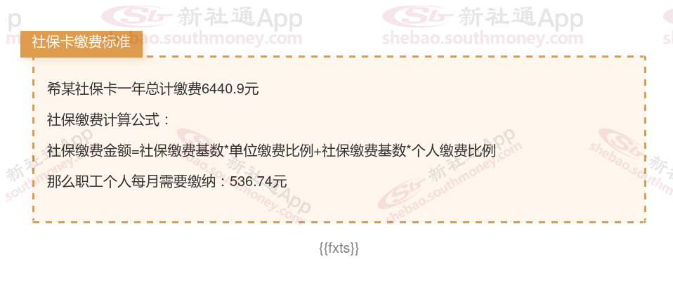 由上图得知,希某社保卡一年需要缴纳6440.9元,个人部分每月需要缴纳536.74元,若您想要了解明细点击新社通社保计算器,来了解一下明细吧。