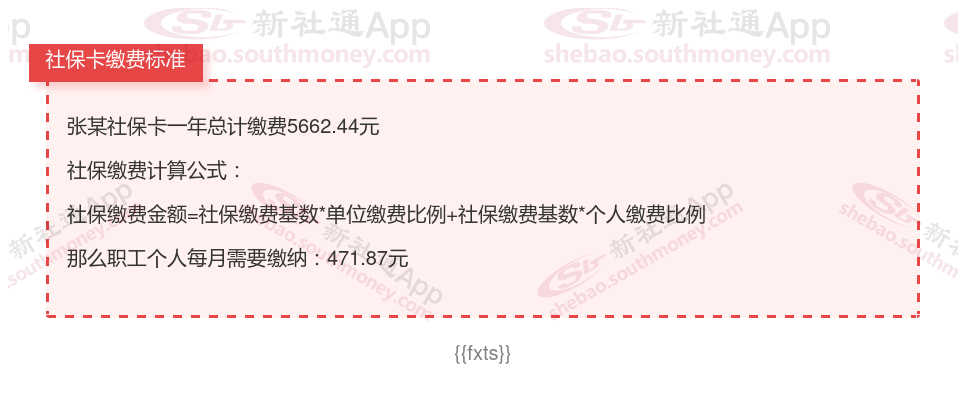 由上图得知,张某社保卡一年需要缴纳5662.44元,个人部分每月需要缴纳471.87元,若您想要了解明细点击新社通社保计算器,来了解一下明细吧。