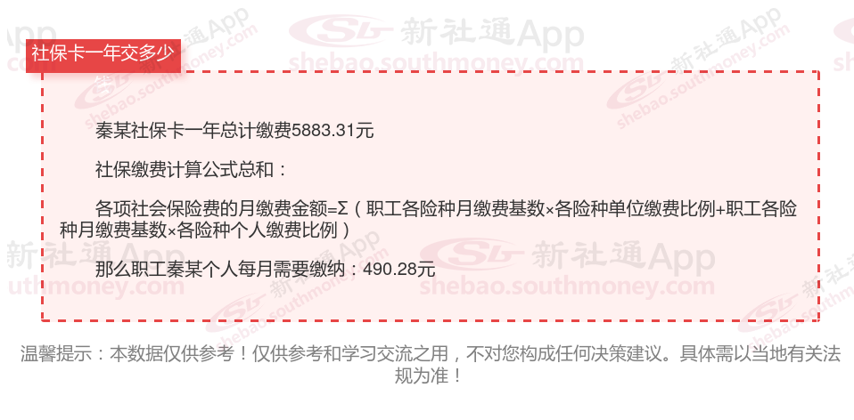 由上图得知,秦某社保卡一年需要缴纳5883.31元,职工个人月缴纳490.28元,若您想要了解明细点击新社通社保计算器,来了解一下明细吧。