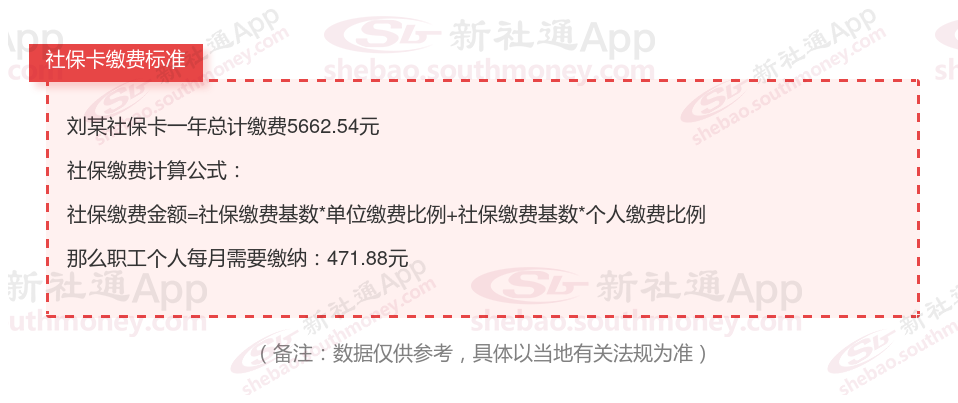 由上图得知,刘某社保卡一年需要缴纳5662.54元,职工个人月缴纳471.88元,若您想要了解明细点击新社通社保计算器,来了解一下明细吧。