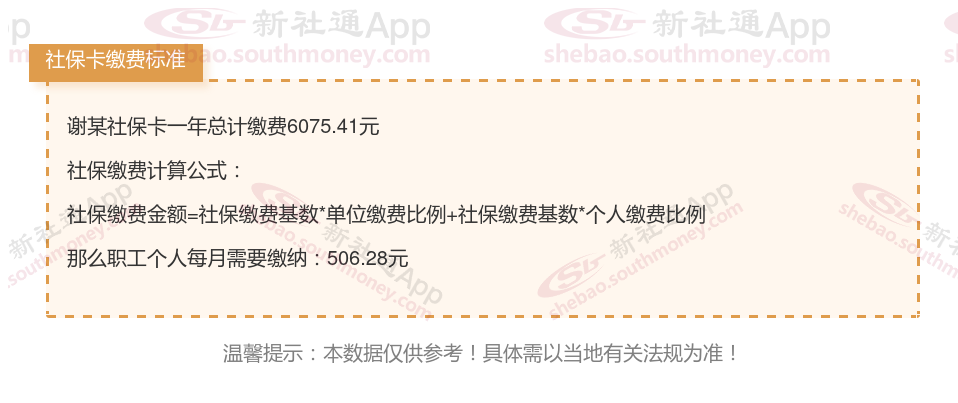 由上图得知,谢某社保卡一年需要缴纳6075.41元,职工个人月缴纳506.28元,若您想要了解明细点击新社通社保计算器,来了解一下明细吧。