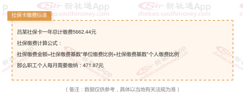 由上图得知,吕某社保卡一年需要缴纳5662.44元,个人部分每月需要缴纳471.87元,若您想要了解明细点击新社通社保计算器,来了解一下明细吧。