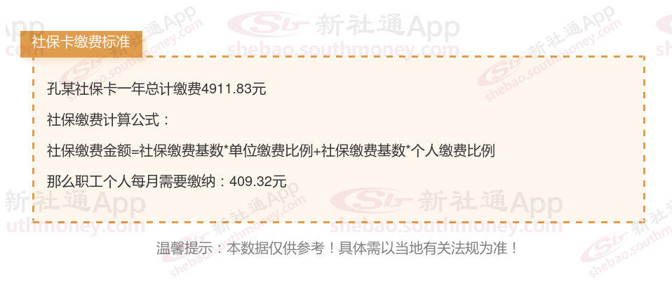 由上图得知,孔某社保卡一年需要缴纳4911.83元,个人部分每月需要缴纳409.32元,若您想要了解明细点击新社通社保计算器,来了解一下明细吧。