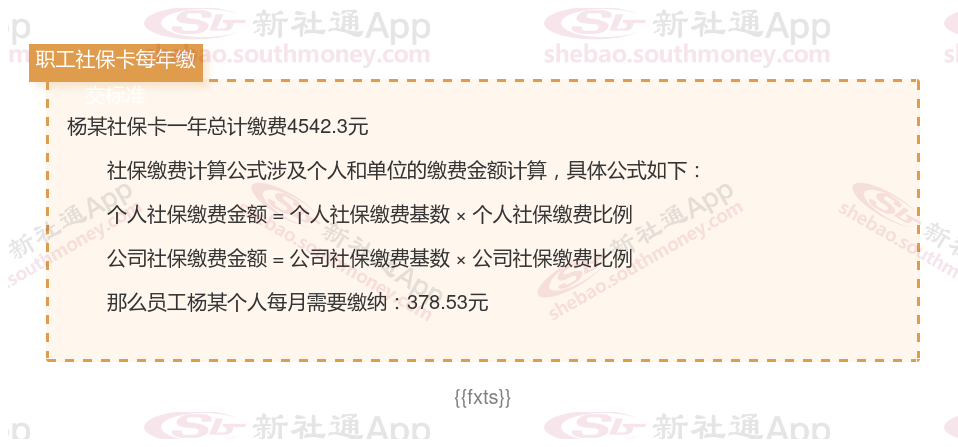 由上图得知,杨某社保卡一年需要缴纳4542.3元,职工个人月缴纳378.53元,若您想要了解明细点击新社通社保计算器,来了解一下明细吧。