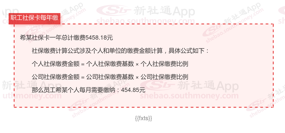 由上图得知,希某社保卡一年需要缴纳5458.18元,个人部分每月需要缴纳454.85元,若您想要了解明细点击新社通社保计算器,来了解一下明细吧。
